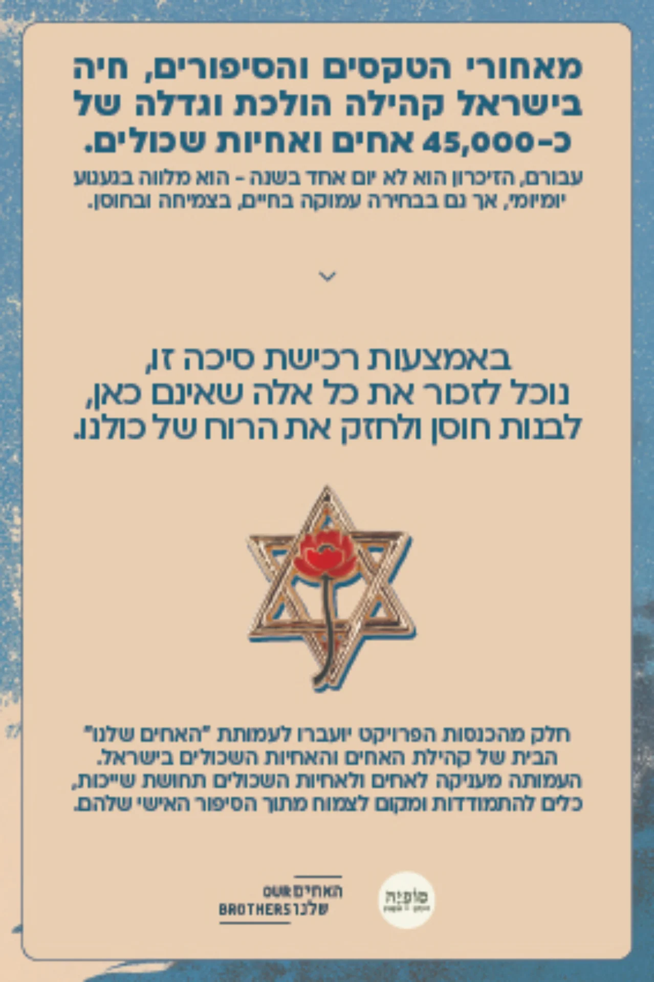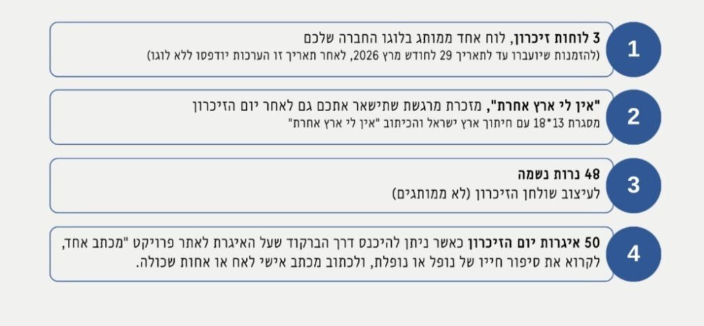 מזמינים אתכם לקחת חלק בפרויקט משמעותי בו תוכלו לרכוש את העמדה שלנו לציון יום הזיכרון אצלכם בארגון ובחברה.